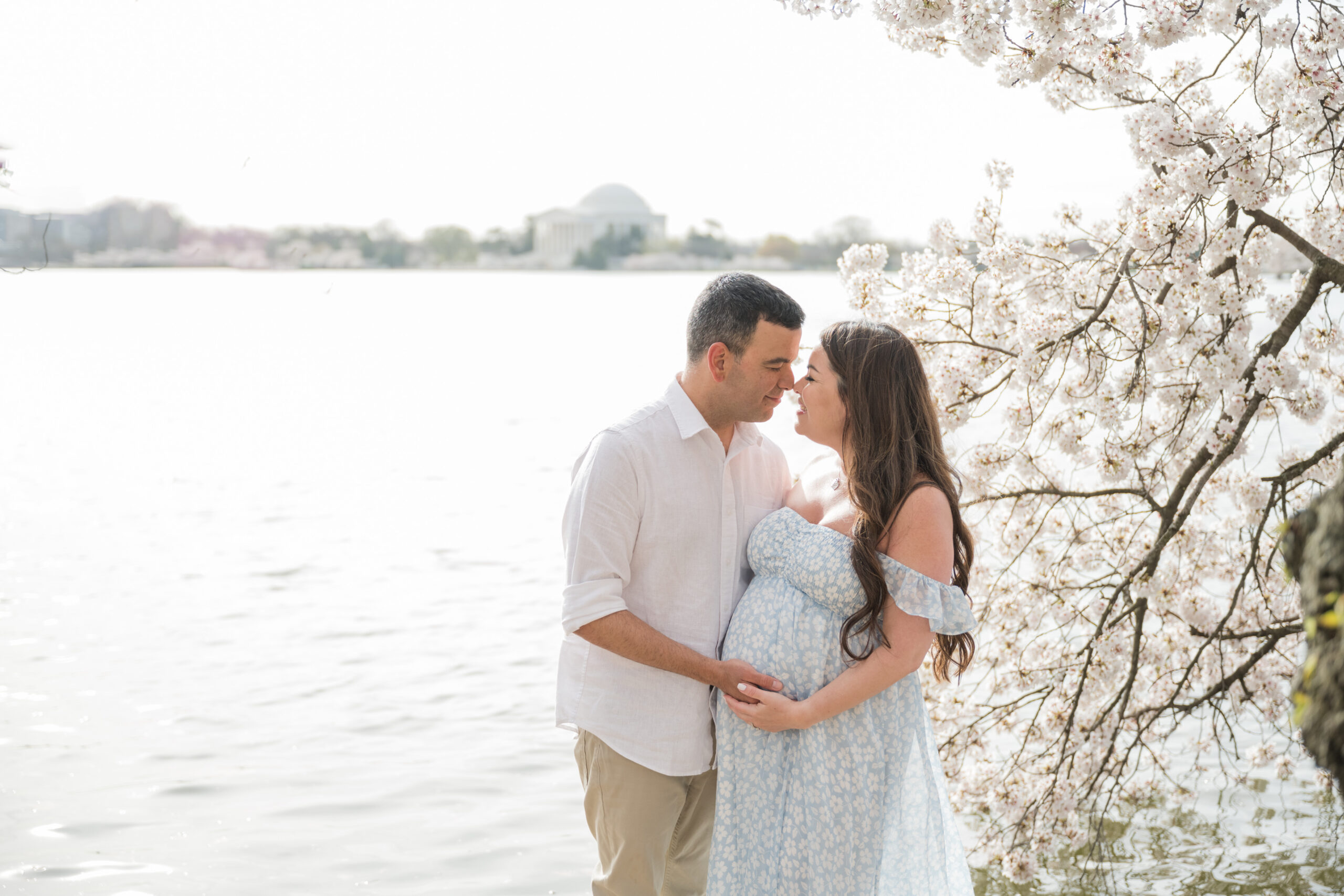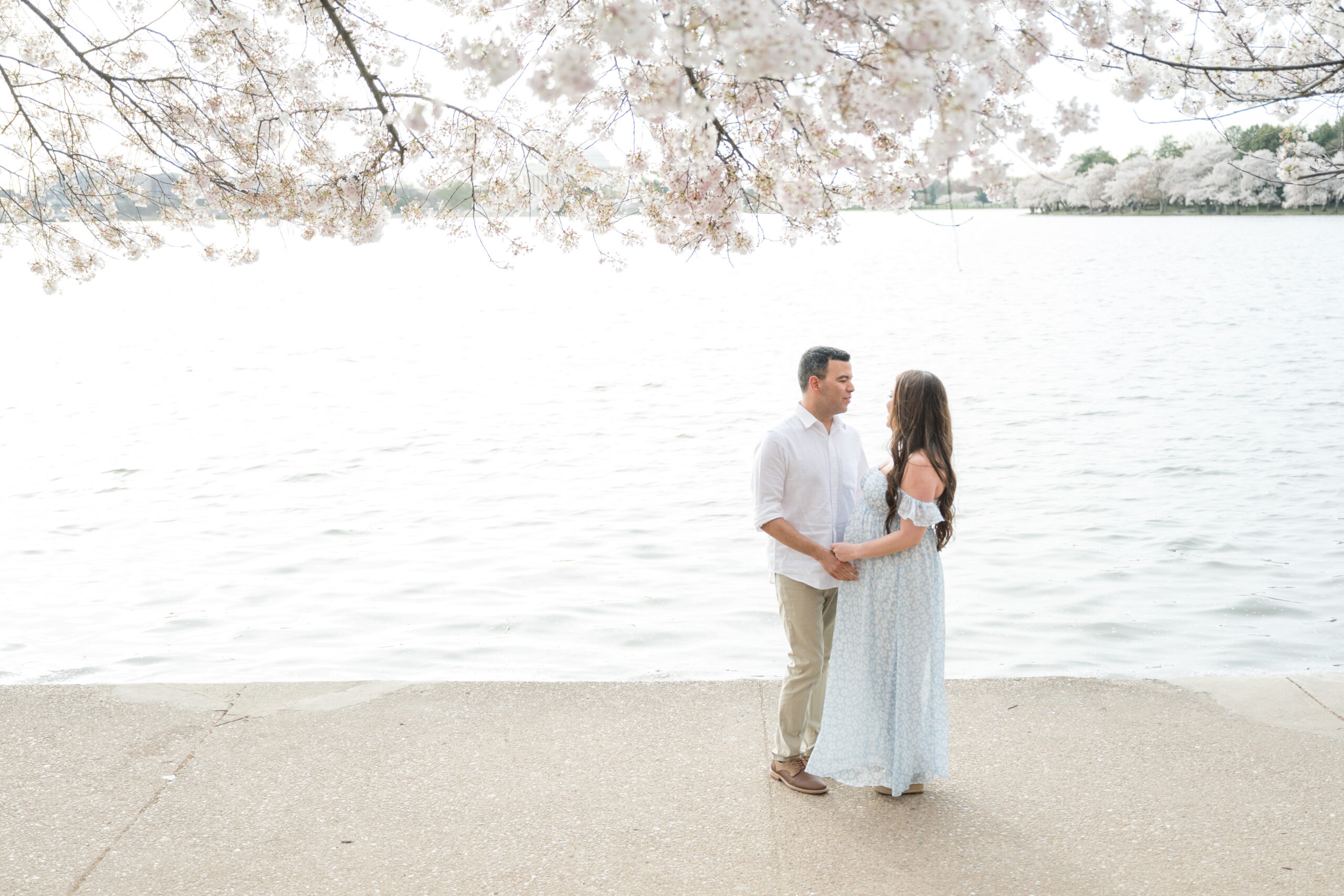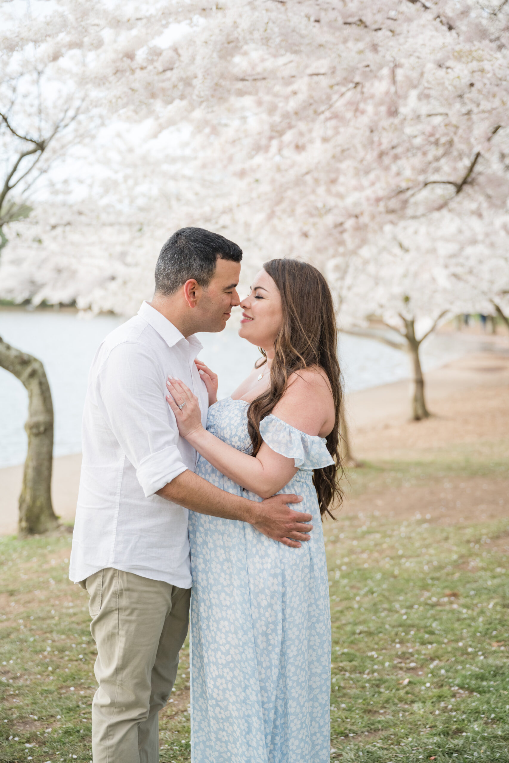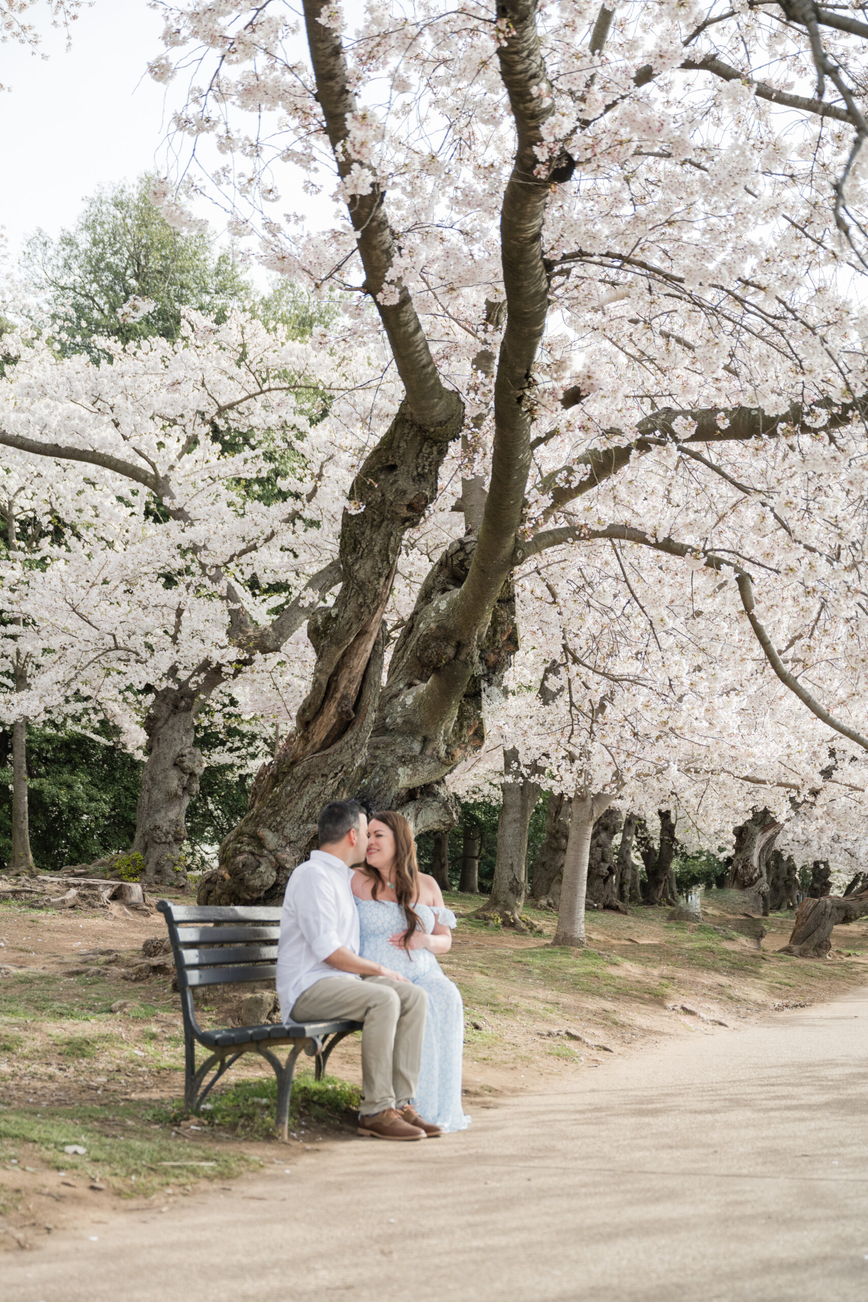 This session took place at the Tidal Basin during peak bloom, when the cherry trees are at their fullest. The timing could not have been more beautiful. Every turn along the water felt calm, romantic, and full of anticipation.