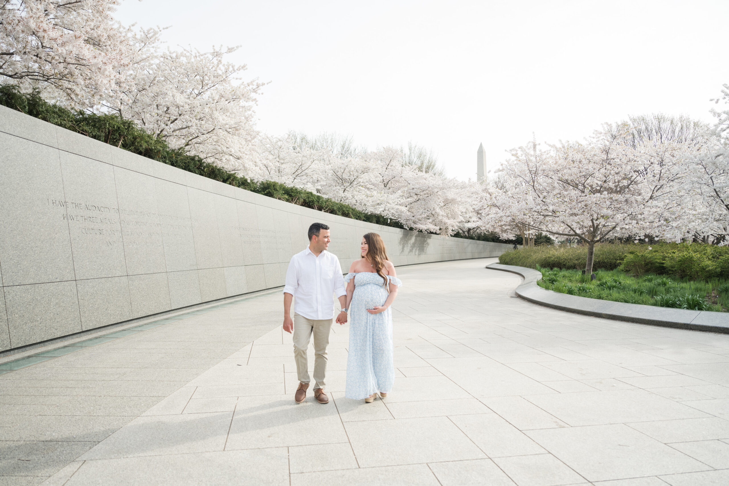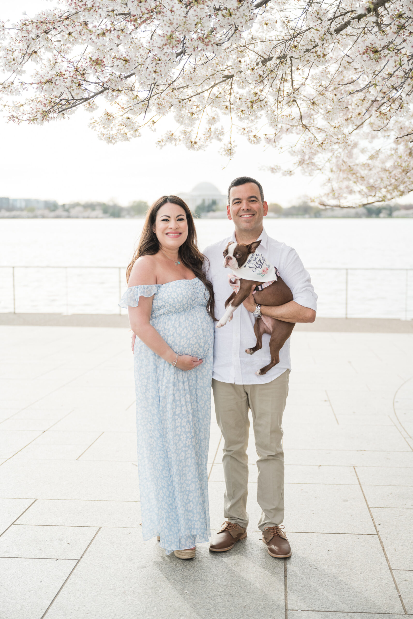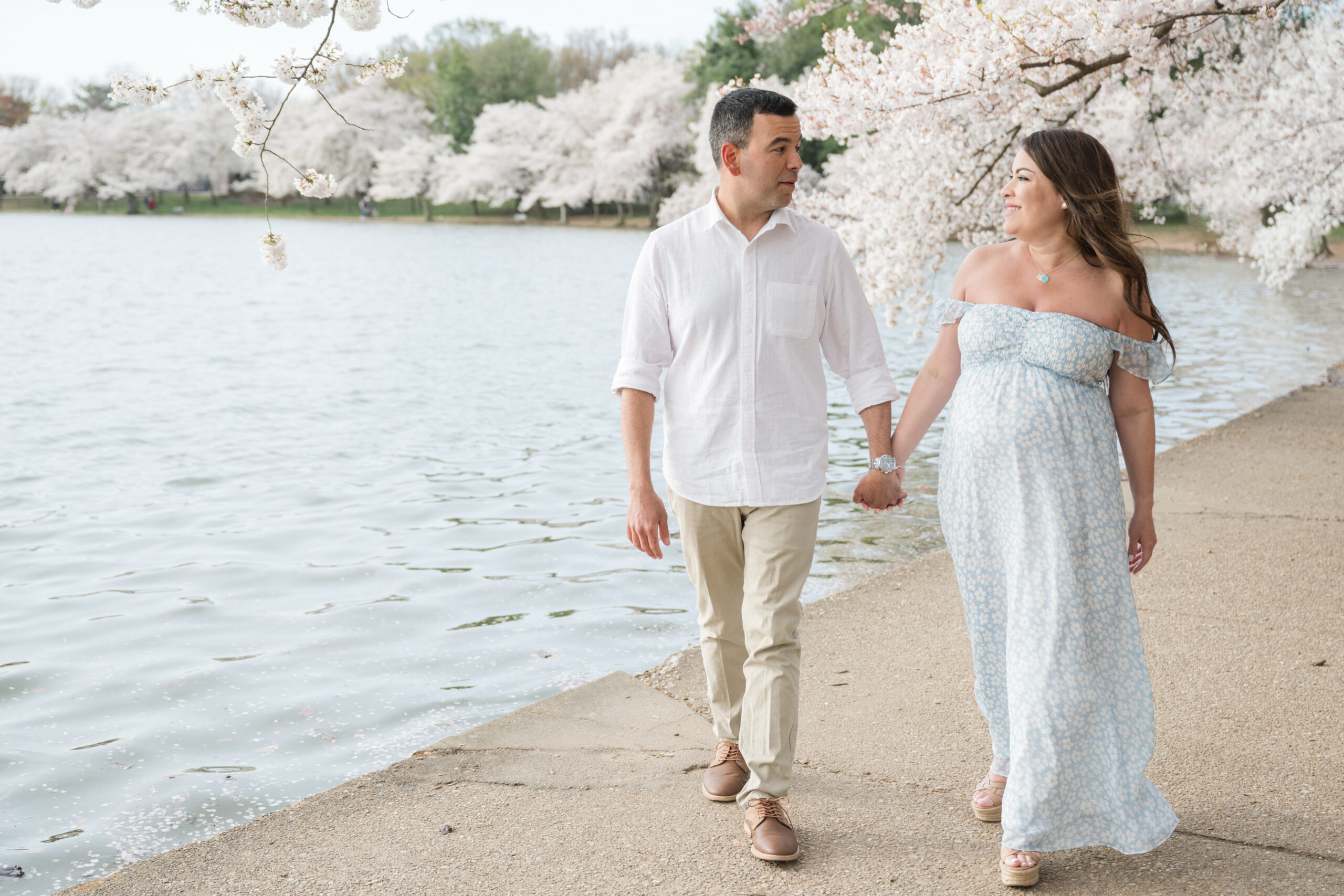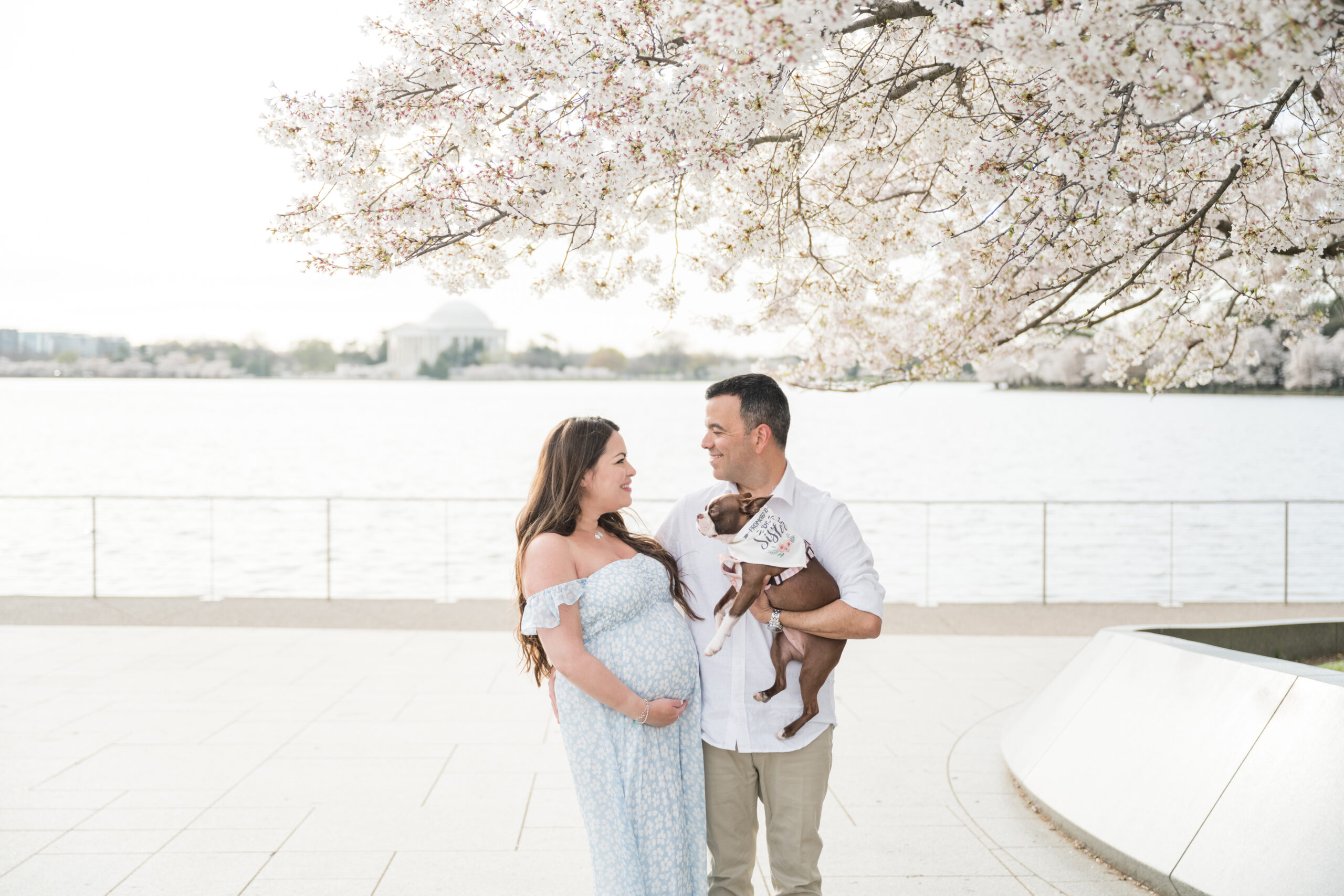 This session took place at the Tidal Basin during peak bloom, when the cherry trees are at their fullest. The timing could not have been more beautiful. Every turn along the water felt calm, romantic, and full of anticipation.